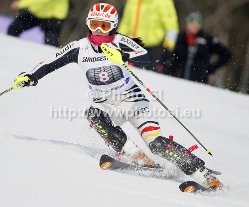 : Christina Geiger of Germany skiing in first run of women slalom race of Audi FIS Alpine skiing World cup in Ofterschwang, Germany. Women slalom race of Audi FIS Alpine skiing World cup was held in Ofterschwang, Germany, on Sunday, 4th of March 2012.