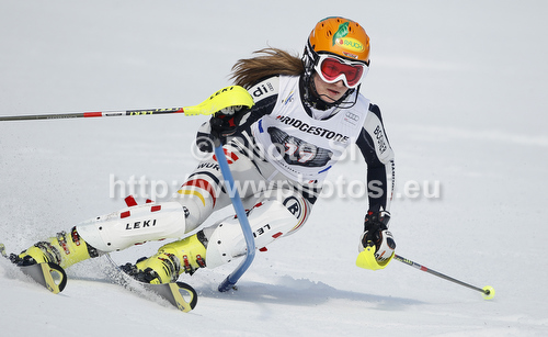 : Lena Duerr of Germany skiing in first run of women slalom race of Audi FIS Alpine skiing World cup in Ofterschwang, Germany. Women slalom race of Audi FIS Alpine skiing World cup was held in Ofterschwang, Germany, on Sunday, 4th of March 2012.