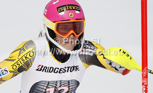 : Marie-Michele Gagnon of Canada skiing in first run of women slalom race of Audi FIS Alpine skiing World cup in Ofterschwang, Germany. Women slalom race of Audi FIS Alpine skiing World cup was held in Ofterschwang, Germany, on Sunday, 4th of March 2012.