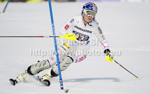 : Lindsey Vonn of USA skiing in first run of women slalom race of Audi FIS Alpine skiing World cup in Ofterschwang, Germany. Women slalom race of Audi FIS Alpine skiing World cup was held in Ofterschwang, Germany, on Sunday, 4th of March 2012.