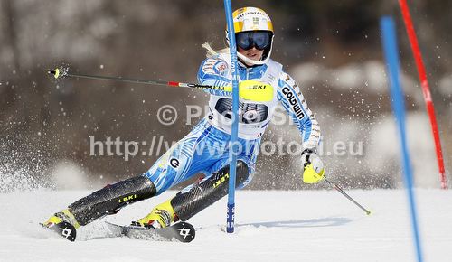: Emelie Wikstroem of Sweden skiing in first run of women slalom race of Audi FIS Alpine skiing World cup in Ofterschwang, Germany. Women slalom race of Audi FIS Alpine skiing World cup was held in Ofterschwang, Germany, on Sunday, 4th of March 2012.