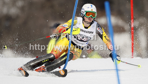 : Erin Mielzynski of Canada skiing in first run of women slalom race of Audi FIS Alpine skiing World cup in Ofterschwang, Germany. Women slalom race of Audi FIS Alpine skiing World cup was held in Ofterschwang, Germany, on Sunday, 4th of March 2012.