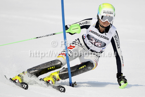 : Fanny Chmelar of Germany skiing in first run of women slalom race of Audi FIS Alpine skiing World cup in Ofterschwang, Germany. Women slalom race of Audi FIS Alpine skiing World cup was held in Ofterschwang, Germany, on Sunday, 4th of March 2012.
