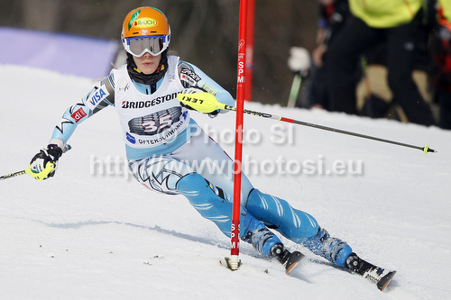 : Resi Stiegler of USA skiing in first run of women slalom race of Audi FIS Alpine skiing World cup in Ofterschwang, Germany. Women slalom race of Audi FIS Alpine skiing World cup was held in Ofterschwang, Germany, on Sunday, 4th of March 2012.