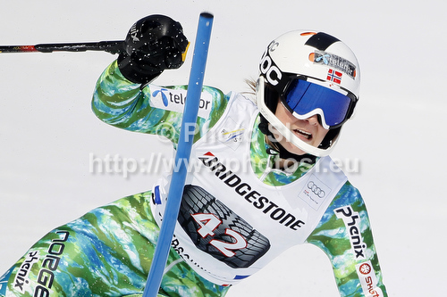 : Nina Loeseth of Norway skiing in first run of women slalom race of Audi FIS Alpine skiing World cup in Ofterschwang, Germany. Women slalom race of Audi FIS Alpine skiing World cup was held in Ofterschwang, Germany, on Sunday, 4th of March 2012.