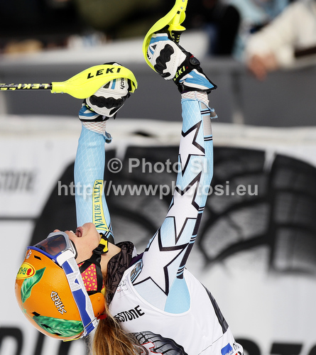 : Second placed Resi Stiegler of USA reacts in finish of second run of women slalom race of Audi FIS Alpine skiing World cup in Ofterschwang, Germany. Women slalom race of Audi FIS Alpine skiing World cup was held in Ofterschwang, Germany, on Sunday, 4th of March 2012.