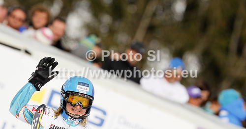 : Fourth placed Tanja Poutiainen of Finland reacts in finish of second run of women slalom race of Audi FIS Alpine skiing World cup in Ofterschwang, Germany. Women slalom race of Audi FIS Alpine skiing World cup was held in Ofterschwang, Germany, on Sunday, 4th of March 2012.