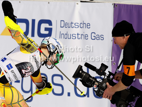 : Winner Erin Mielzynski of Canada reacts in finish of second run of women slalom race of Audi FIS Alpine skiing World cup in Ofterschwang, Germany. Women slalom race of Audi FIS Alpine skiing World cup was held in Ofterschwang, Germany, on Sunday, 4th of March 2012.