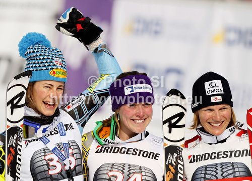Ofterschwang ,Germany - 04.03.2012 : Winner Erin Mielzynski of Canada (M), second placed Resi Stiegler of USA (L) and third placed Marlies Schild of Austria (R) celebrate their medals won in women slalom race of Audi FIS Alpine skiing World cup in Ofterschwang, Germany. Women slalom race of Audi FIS Alpine skiing World cup was held in Ofterschwang, Germany, on Sunday, 4th of March 2012. Photo by: Primoz Jeroncic