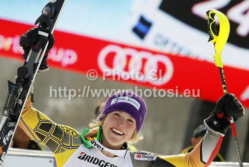 : Winner Erin Mielzynski of Canada celebrates her medal won in women slalom race of Audi FIS Alpine skiing World cup in Ofterschwang, Germany. Women slalom race of Audi FIS Alpine skiing World cup was held in Ofterschwang, Germany, on Sunday, 4th of March 2012.