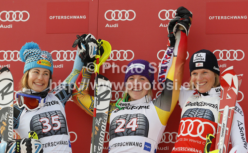 : Winner Erin Mielzynski of Canada (M), second placed Resi Stiegler of USA (L) and third placed Marlies Schild of Austria (R) celebrate their medals won in women slalom race of Audi FIS Alpine skiing World cup in Ofterschwang, Germany. Women slalom race of Audi FIS Alpine skiing World cup was held in Ofterschwang, Germany, on Sunday, 4th of March 2012.