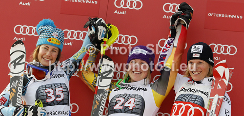 : Winner Erin Mielzynski of Canada (M), second placed Resi Stiegler of USA (L) and third placed Marlies Schild of Austria (R) celebrate their medals won in women slalom race of Audi FIS Alpine skiing World cup in Ofterschwang, Germany. Women slalom race of Audi FIS Alpine skiing World cup was held in Ofterschwang, Germany, on Sunday, 4th of March 2012.
