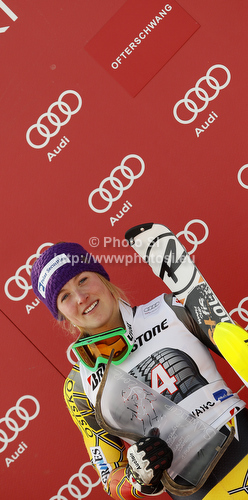 Ofterschwang ,Germany - 04.03.2012 : Winner Erin Mielzynski of Canada celebrates her medal won in women slalom race of Audi FIS Alpine skiing World cup in Ofterschwang, Germany. Women slalom race of Audi FIS Alpine skiing World cup was held in Ofterschwang, Germany, on Sunday, 4th of March 2012. Photo by: Primoz Jeroncic