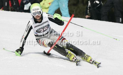 : Fanny Chmelar of Germany skiing in first run of women slalom race of Audi FIS Alpine skiing World cup in Ofterschwang, Germany. Women slalom race of Audi FIS Alpine skiing World cup was held in Ofterschwang, Germany, on Sunday, 4th of March 2012.