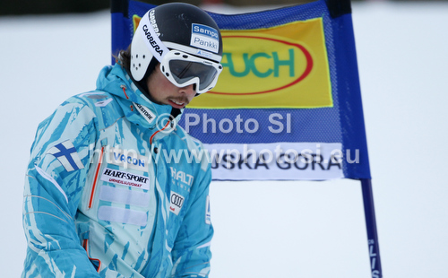 : Forerunner Andreas Romar of Finland during inspection of first run of men giant slalom race of Audi FIS Alpine skiing World cup in Kranjska Gora, Slovenia. Men slalom race of Audi FIS Alpine skiing World cup was held in Kranjska Gora, Slovenia, on Saturday, 10th of March 2012.