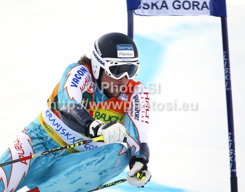 : Forerunner Andreas Romar of Finland skiing in first run of men giant slalom race of Audi FIS Alpine skiing World cup in Kranjska Gora, Slovenia. Men slalom race of Audi FIS Alpine skiing World cup was held in Kranjska Gora, Slovenia, on Saturday, 10th of March 2012.
