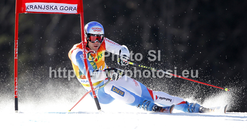 : Didier Defago of Switzerland skiing in first run of men giant slalom race of Audi FIS Alpine skiing World cup in Kranjska Gora, Slovenia. Men slalom race of Audi FIS Alpine skiing World cup was held in Kranjska Gora, Slovenia, on Saturday, 10th of March 2012.