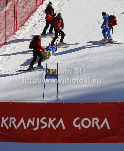 : Florian Eisath of Italy is being taken down by rescue service after crashing in second run of men giant slalom race of Audi FIS Alpine skiing World cup in Kranjska Gora, Slovenia. Men slalom race of Audi FIS Alpine skiing World cup was held in Kranjska Gora, Slovenia, on Saturday, 10th of March 2012.