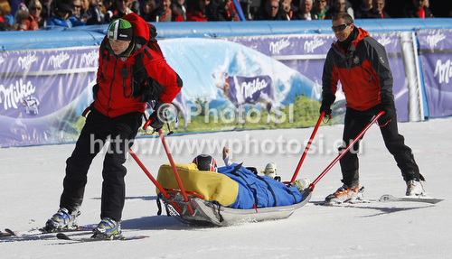 : Florian Eisath of Italy is being taken down by rescue service after crashing in second run of men giant slalom race of Audi FIS Alpine skiing World cup in Kranjska Gora, Slovenia. Men slalom race of Audi FIS Alpine skiing World cup was held in Kranjska Gora, Slovenia, on Saturday, 10th of March 2012.