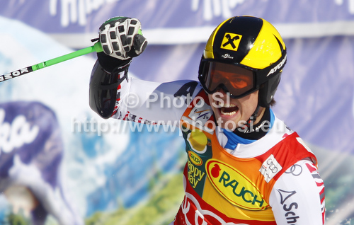 : Third placed Marcel Hirscher of Austria reacts in finish of second run of men giant slalom race of Audi FIS Alpine skiing World cup in Kranjska Gora, Slovenia. Men slalom race of Audi FIS Alpine skiing World cup was held in Kranjska Gora, Slovenia, on Saturday, 10th of March 2012.