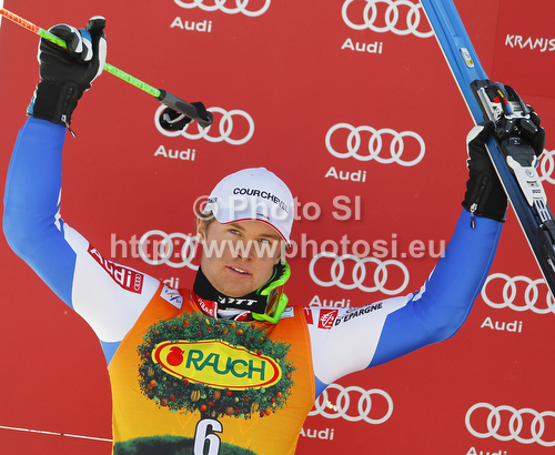 Kranjska Gora ,Slovenia - 10.03.2012 : Second placed Alexis Pinturault of France celebrates his medal won in men giant slalom race of Audi FIS Alpine skiing World cup in Kranjska Gora, Slovenia. Men slalom race of Audi FIS Alpine skiing World cup was held in Kranjska Gora, Slovenia, on Saturday, 10th of March 2012. Photo by: Primoz Jeroncic