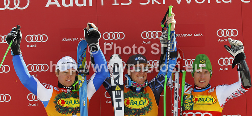 : Winner Ted Ligety of USA (M), second placed Alexis Pinturault of France (L) and third placed Marcel Hirscher of Austria (R) celebrate their medals won in men giant slalom race of Audi FIS Alpine skiing World cup in Kranjska Gora, Slovenia. Men slalom race of Audi FIS Alpine skiing World cup was held in Kranjska Gora, Slovenia, on Saturday, 10th of March 2012.