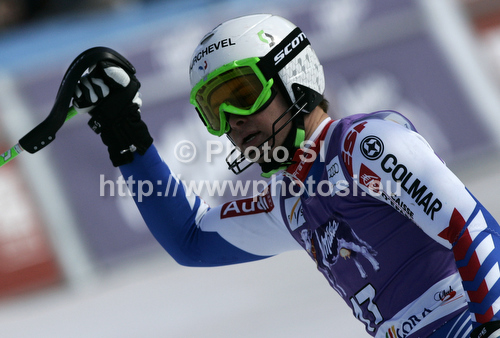 : Third placed Alexis Pinturault of France reacts in finish of second run of men slalom race of Audi FIS Alpine skiing World cup in Kranjska Gora, Slovenia. Men slalom race of Audi FIS Alpine skiing World cup was held in Kranjska Gora, Slovenia, on Sunday, 11th of March 2012.