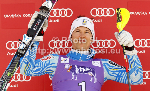 Kranjska Gora ,Slovenia - 11.03.2012 : Winner Andre Myhrer of Sweden celebrates his medal won in men slalom race of Audi FIS Alpine skiing World cup in Kranjska Gora, Slovenia. Men slalom race of Audi FIS Alpine skiing World cup was held in Kranjska Gora, Slovenia, on Sunday, 11th of March 2012. Photo by: Primoz Jeroncic