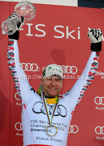 Schladming ,Austria - 13.03.2012 : Klaus Kroell of Austria celebrates his Downhill overall FIS Alpine skiing World cup victory after downhill race of Audi FIS Alpine skiing World cup finals in Schladming, Austria. Men downhill race of Audi FIS Alpine skiing World cup finals was held in Schladming, Austria, on Wednesday, 14th of March 2012. Photo by: Pool / PhotoSI