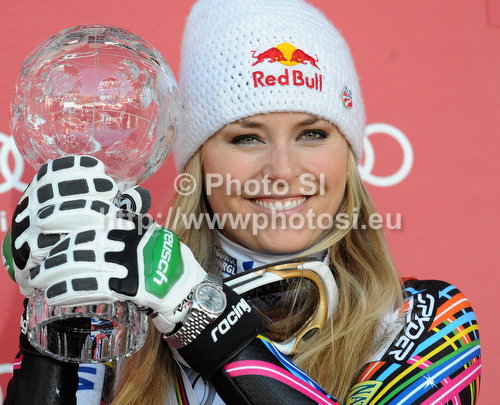 : Lindsey Vonn of USA celebrates her Downhill overall FIS Alpine skiing World cup victory after downhill race of Audi FIS Alpine skiing World cup finals in Schladming, Austria. Women downhill race of Audi FIS Alpine skiing World cup finals was held in Schladming, Austria, on Wednesday, 14th of March 2012.