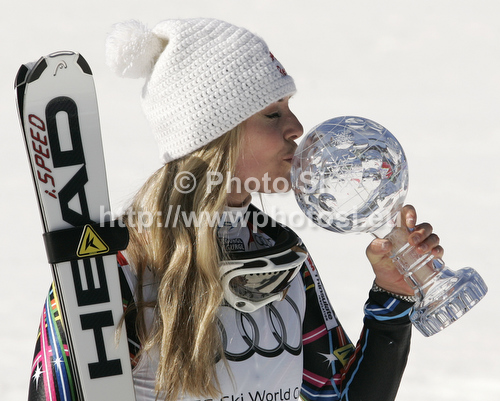 : Lindsey Vonn of USA celebrates her overall victory in men downhill Audi FIS Alpine skiing World cup finals in Schladming, Austria. Last women downhill race of Audi FIS Alpine skiing World cup finals was held in Schladming, Austria, on Wednesday, 14th of March 2012.