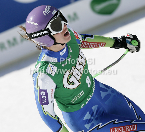 : reacts in finish of women downhill race of Audi FIS Alpine skiing World cup finals in Schladming, Austria. Women downhill race of Audi FIS Alpine skiing World cup finals was held in Schladming, Austria, on Wednesday, 14th of March 2012.