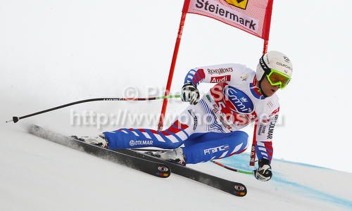 : Second placed Alexis Pinturault of France skiing in men super-g race of Audi FIS Alpine skiing World cup finals in Schladming, Austria. Men super-g race of Audi FIS Alpine skiing World cup finals was held in Schladming, Austria, on Thursday, 15th of March 2012.