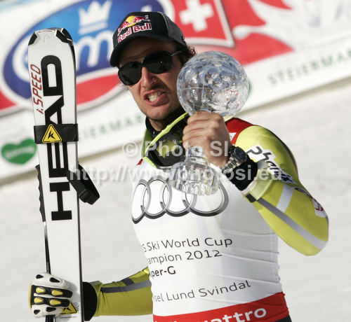 : Aksel Lund Svindal of Norway celebrates his overall victory in men Super-G Audi FIS Alpine skiing World cup finals in Schladming, Austria. Last men Super-G race of Audi FIS Alpine skiing World cup finals was held in Schladming, Austria, on Thursday, 15th of March 2012.