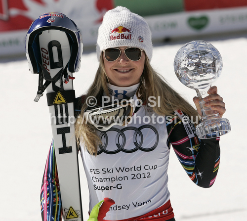 : Lindsey Vonn of USA celebrates her overall victory in women Super-G Audi FIS Alpine skiing World cup finals in Schladming, Austria. Last women Super-G race of Audi FIS Alpine skiing World cup finals was held in Schladming, Austria, on Thursday, 15th of March 2012.
