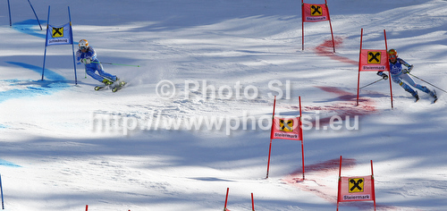 : Therese Borssen of Sweden (L) and Resi Stiegler of USA (R) skiing in team event race of Audi FIS Alpine skiing World cup finals in Schladming, Austria. Team event race of Audi FIS Alpine skiing World cup finals was held in Schladming, Austria, on Friday, 16th of March 2012.