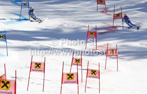: Frida Hansdotter of Sweden (R) and Julia Mancuso of USA (L) skiing in team event race of Audi FIS Alpine skiing World cup finals in Schladming, Austria. Team event race of Audi FIS Alpine skiing World cup finals was held in Schladming, Austria, on Friday, 16th of March 2012.