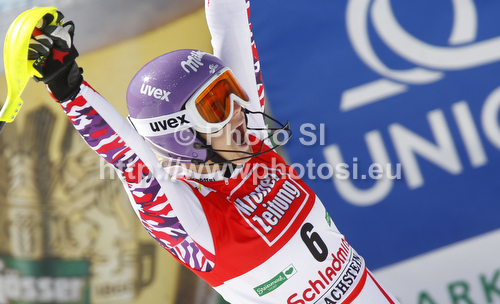 : Winner Michaela Kirchgasser of Austria reacts in finish of second run of women slalom race of Audi FIS Alpine skiing World cup finals in Schladming, Austria. Women slalom race of Audi FIS Alpine skiing World cup finals was held in Schladming, Austria, on Saturday, 17th of March 2012.