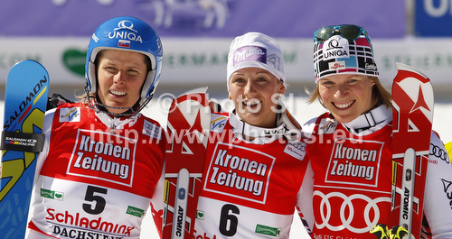 Schladming ,Austria - 17.03.2012 : Winner Michaela Kirchgasser of Austria (M), second placed Veronika Zuzulova of Slovakia (L) and third placed Marlies Schild of Austria (R) celebrate their medals won in women slalom race of Audi FIS Alpine skiing World cup finals in Schladming, Austria. Women slalom race of Audi FIS Alpine skiing World cup finals was held in Schladming, Austria, on Saturday, 17th of March 2012. Photo by: Tomaz Jeroncic