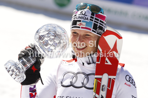 Schladming ,Austria - 17.03.2012 : Overall slalom World cup winner Marlies Schild of Austria celebrates her trophy after last women slalom race of Audi FIS Alpine skiing World cup finals in Schladming, Austria. Women slalom race of Audi FIS Alpine skiing World cup finals was held in Schladming, Austria, on Saturday, 17th of March 2012. Photo by: Tomaz Jeroncic