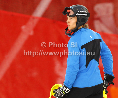 : Santeri Paloniemi of Finland during course inspection before start of first run of men slalom race of Audi FIS Alpine skiing World cup finals in Schladming, Austria. Men slalom race of Audi FIS Alpine skiing World cup finals was held in Schladming, Austria, on Sunday, 18th of March 2012.