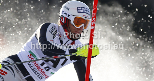 : Fritz Dopfer of Germany skiing in first run of men slalom race of Audi FIS Alpine skiing World cup finals in Schladming, Austria. Men slalom race of Audi FIS Alpine skiing World cup finals was held in Schladming, Austria, on Sunday, 18th of March 2012.