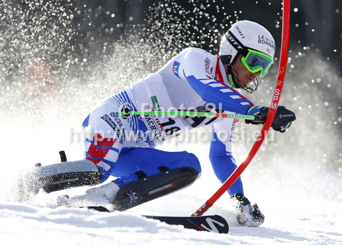 : Steve Missillier of France skiing in first run of men slalom race of Audi FIS Alpine skiing World cup finals in Schladming, Austria. Men slalom race of Audi FIS Alpine skiing World cup finals was held in Schladming, Austria, on Sunday, 18th of March 2012.