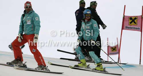 : Tanja Poutiainen of Finland (R) with her coach Christian Thoma (L) during course inspection before start of first run of women giant slalom race of Audi FIS Alpine skiing World cup finals in Schladming, Austria. Women giant slalom race of Audi FIS Alpine skiing World cup finals was held in Schladming, Austria, on Sunday, 18th of March 2012.