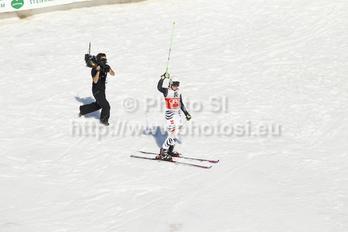 : Winner Viktoria Rebensburg of Germany reacts in finish of second run of women giant slalom race of Audi FIS Alpine skiing World cup finals in Schladming, Austria. Women giant slalom race of Audi FIS Alpine skiing World cup finals was held in Schladming, Austria, on Sunday, 18th of March 2012.