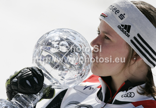 Schladming ,Austria - 18.03.2012 : Overall giant slalom World cup winner Viktoria Rebensburg of Germany celebrates her trophy after end of last women giant slalom race of Audi FIS Alpine skiing World cup finals in Schladming, Austria. Women giant slalom race of Audi FIS Alpine skiing World cup finals was held in Schladming, Austria, on Sunday, 18th of March 2012. Photo by: Tomaz Jeroncic