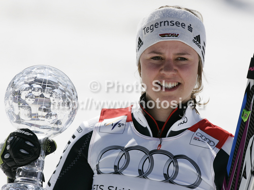 : Overall giant slalom World cup winner Viktoria Rebensburg of Germany celebrates her trophy after end of last women giant slalom race of Audi FIS Alpine skiing World cup finals in Schladming, Austria. Women giant slalom race of Audi FIS Alpine skiing World cup finals was held in Schladming, Austria, on Sunday, 18th of March 2012.