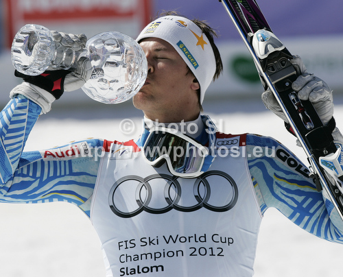 Schladming ,Austria - 18.03.2012 : Overall slalom World cup winner Andre Myhrer of Sweden celebrates his trophy after last men slalom race of Audi FIS Alpine skiing World cup finals in Schladming, Austria. Men slalom race of Audi FIS Alpine skiing World cup finals was held in Schladming, Austria, on Sunday, 18th of March 2012. Photo by: Tomaz Jeroncic