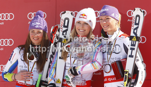 : Overall FIS alpine skiing World cup winner Lindsey Vonn of USA (M), second placed Tina Maze of Slovenia (L) and third placed Maria Hoefl-Riesch of Germany (R) celebrate their medals after last race of Audi FIS Alpine skiing World cup finals in Schladming, Austria. Last women race of Audi FIS Alpine skiing World cup finals was held in Schladming, Austria, on Sunday, 18th of March 2012.