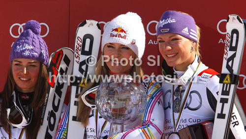 : Overall FIS alpine skiing World cup winner Lindsey Vonn of USA (M), second placed Tina Maze of Slovenia (L) and third placed Maria Hoefl-Riesch of Germany (R) celebrate their medals after last race of Audi FIS Alpine skiing World cup finals in Schladming, Austria. Last women race of Audi FIS Alpine skiing World cup finals was held in Schladming, Austria, on Sunday, 18th of March 2012.